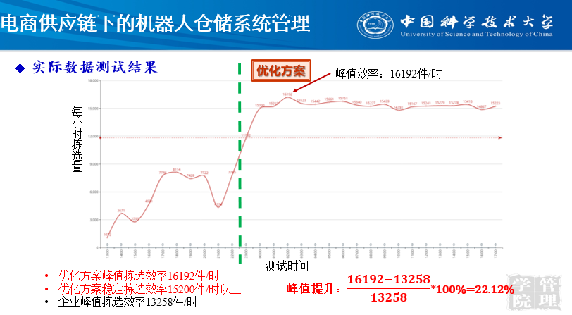 近几年,很多媒体都在关注机器人分拣系统,我们国家在这方面做得非常好,包括海康威视、中国邮政等。这里举一个例子,机器人在分拣的时候,会把货物抛进一个个格口,每个格口可能对应一个城市,就是把大量的订单送到格口,再派送到全国上百个城市。我们把京东、阿里、Amazon等大平台比较流行的商业软件做智能决策的结果调出来,发现了格口流量不平衡和订单-格口指派不合理的问题。针对这些问题,我们提出了整个仓储中心的解决方案,通过地址的流量拆分与组合,使实际投递量与目标投递量的最大差值最小,采用就近投递原则,使总物理投递距离最小。实时数据测试结果显示,下图绿线左侧是现有机器人仓储系统的运营效率(每小时拣选量),绿线右侧是用我们的解决方案优化之后的效率,可以看到峰值效率提升了22%。大家看到的这种高效的算法背后实际上有巨大的提升空间,没有我们想象的好,只是一个可行解的解决方案而已,包括我们最近做的一套算法,和最优解还有一些距离。