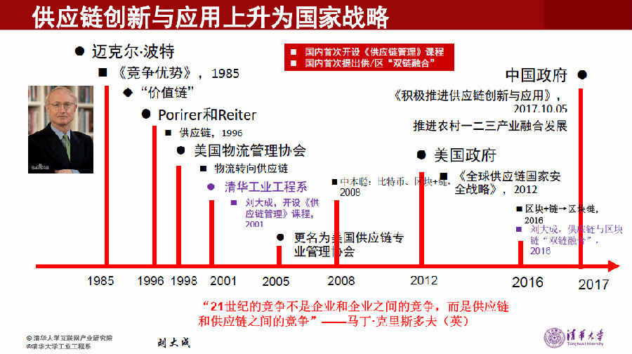 1996年提出的供应链定义最早得自于1985年迈克尔﹒波特在《竞争优势》一书中的价值链,全球最大物流学术组织——美国物流管理协会在1998年就提出“物流将转向供应链”,到了2005年干脆更名为美国供应链专业管理协会,而更名后的第一届协会会士奖就授予给了牛津大学教授马丁·克里斯多夫,表彰他在1999年提出的“二十一世纪的竞争不再是企业和企业之间的竞争,而是供应链和供应链之间的竞争”断言。