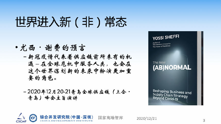 尤西・谢费的新书《The new (AB)NORMAL》中预言新冠疫情带给了全球供应链前所未有的机会,在全球危机中供应链仍然在服务人类,也会在世界谋划新的未来中扮演着更加重要的角色。