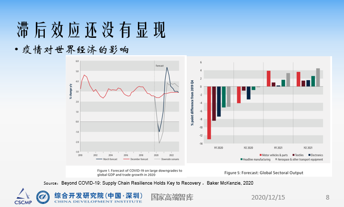 我们应该关注疫情滞后的效应,疫情的影响还远远没有出现。世界经济论坛发布的全球贸易数字订单交易量呈现萎缩趋势,2021年,世界经济的“深蹲”和“反弹”才会出现。从2020年第一季度到2021年的第一季度、第二季度这些主要的制造业行业才会有一些反转。疫情的滞后的影响还没有完全体现出来。