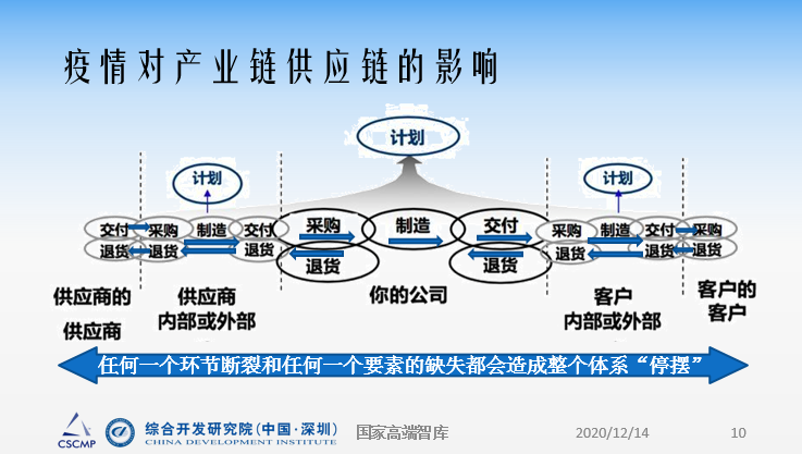 缓冲期实际就是用库存在生产;多米诺就是供应链彻底断裂;供应链的韧性指的是抗打击能力和恢复能力。理想状况是能够保持供应链的连续,次一级的状况是要让供应链受断裂冲击的影响比较小,恢复的速度比较快。如果没有之前的这一套安全预警的体系,遇到危机的时候,供应链的影响程度一定是深的,恢复的速度一定是慢的。