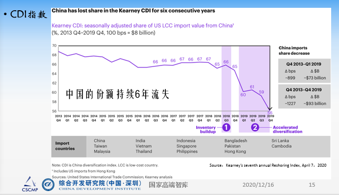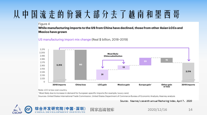 疫情和贸易战对中国的产业造成了什么样的、什么程度的影响?科尔尼每年会公布Reshoring Index,叫《回流指数》,从2019年开始曲线出现大幅度的上升,从中国对美的制造业出口来说,2019年中国损失了900亿美元。这900亿去哪里?310亿去了东南亚的低成本的国家,130亿去了墨西哥,230亿去了欧洲,150亿去了其他地方。