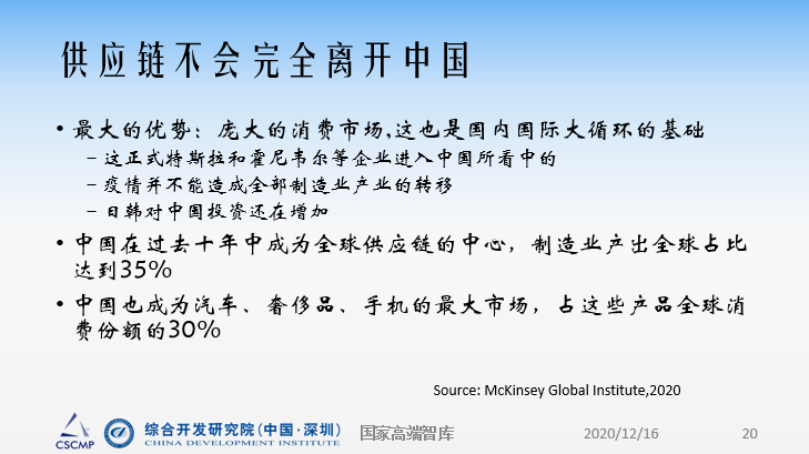 疫情的的确确对中国制造业造成了影响,但供应链不会完全离开中国,我国现在是以国内大循环为主体、国际国内双循环这样一个新发展格局。