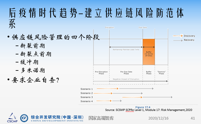 《EPIC供应链风险评估报告》显示,中国在供应链的能力上面排名靠前,第13名。供应链的风险管理分为四个阶段,断裂前期、断裂点前期、缓冲期和多米诺期。
