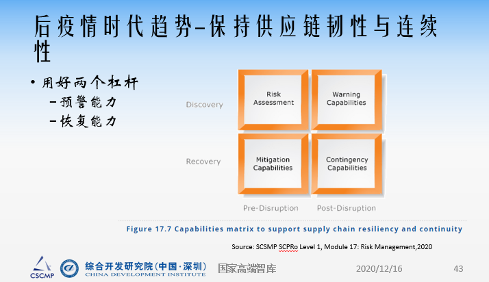 保持供应链的韧性要用好两个杠杆:一个是预警能力,风险评估的能力和预警的准确性和速度。一个是灾后恢复能力和保持供应链连续性。