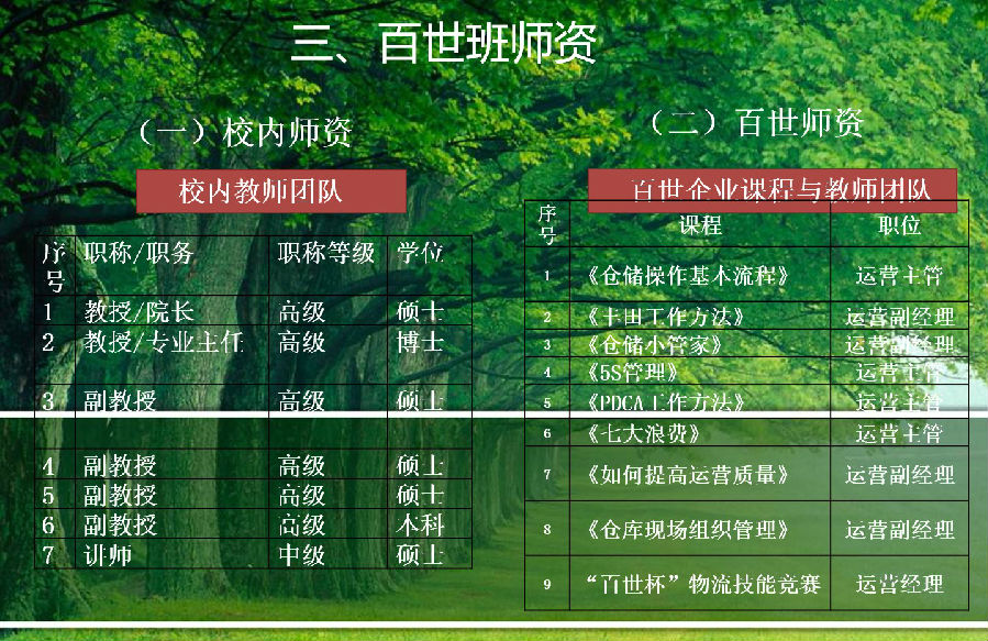 广东女院物流管理专业是第一批中央财政支持的物流实训基地,也是中国物流学会产学研基地,承办了广东省各类物流技能竞赛,同时学校也获得了第七届广东省教学成果一等奖、2020中国物流行指委教学成果二等奖。而百世广东分公司在佛山有里水仓、陈村仓,广州有南沙仓,配备有现代化的物流设施设备,具有物流实训的现实条件。