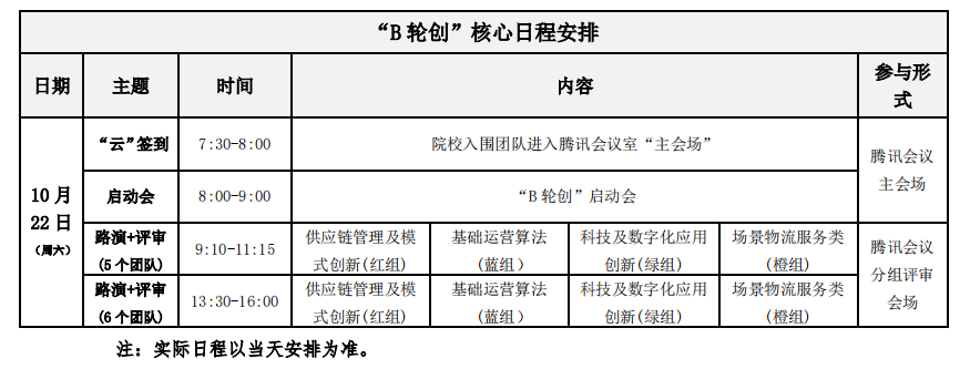 根据中国物流学会《关于举办2022第七届“日日顺创客训练营”的通知》(物学字〔2022〕8号)的通知精神,结合院校“A轮研”环节实际情况,现就“B轮创”(创客亮剑-路演PK)环节活动相关事宜通知如下: