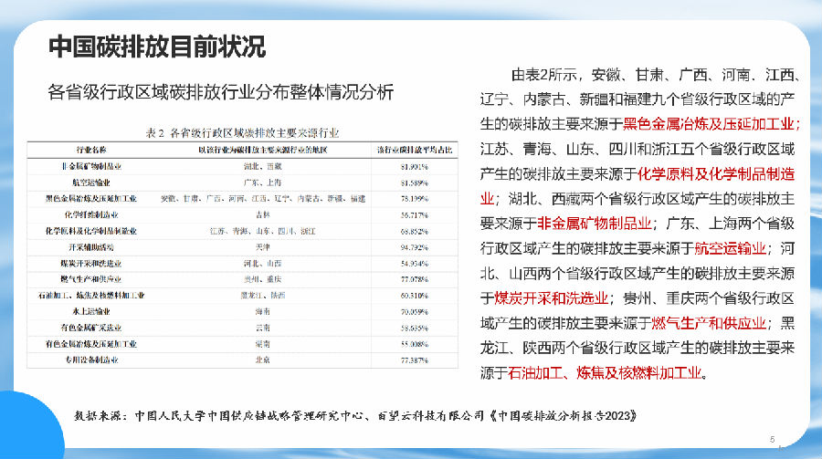 我们再来看各个省份主要的排放行业,我们统计了一下,安徽、甘肃等9个省级行政区的排放主要是黑色金属冶炼和压延加工业,像江苏省、青海、山东、四川、浙江五个行政区主要的碳排放是化学原料以及化学制品制造业,湖北西藏这两个省是非金属矿物制品业,广东上海主要是航空运输业,河北、陕西主要是煤炭,黑龙江、陕西主要是石油加工、炼焦和核燃料加工业。
