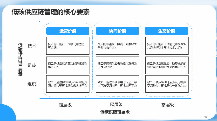 1. 链层级低碳供应链。在技术方面,要形成组织供应链技术规范和标准,数字化治理是一种集中化治理方式。比如华能智联,试图从九个方面来实现链层级低碳供应链,包括交易线上化、车辆网联化、载具再电气化、仓配智能化、运维可视化、资产数字化、金融普惠化、碳迹标准化、制造低碳化,这是站在一个微观层面的层级来实现的低碳化。