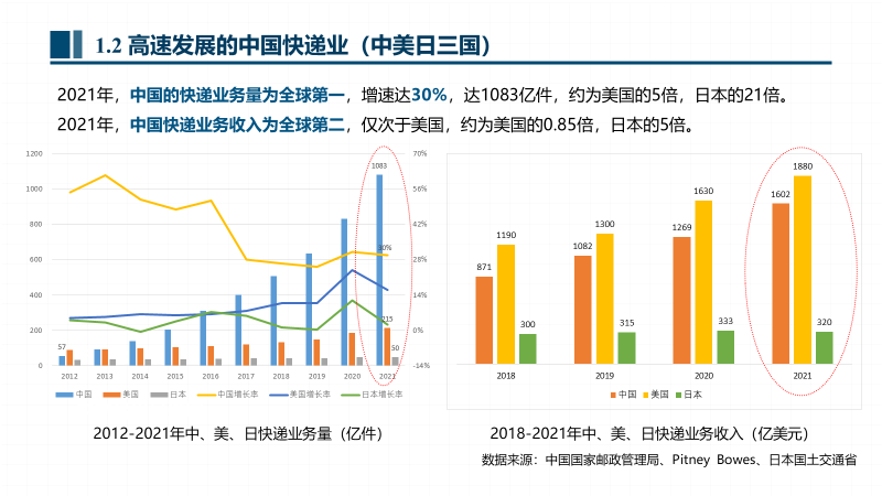 在国内快递市场中,21年中国邮政速递物流占了9.23%,达100亿件。业务市场上,“四通一达”占70.73%,加之顺丰、京东等,占据快递物流市场主体。在城市快递业务构成中,同城快递占了15%左右,异地快递达到了85%以上。在区域快递业务量的排位当中,东部经济发达地区,如:广东、浙江、江苏、山东、河北的快递业务量大和业务件数多。快递业务量的城乡分布情况呢,从2017年的71%比28%,到2021年底降为了66%和32%,农村快递量是在不断增加的。需要指出的是,目前我国快递业发展,仍然呈现出明显的东中西分布的差异特征,21年东部地区快递业务量占全国的78.1%,而中西部地区占比就偏低了,特别是西部12省市区仅占全国的7.3%,看出我国快递业也存在明显的“胡焕庸线”。在全国前15个城市的快递业务量排位当中,排前三位是金华、广州与深圳,四川成都排12位,在西部地区是处于前列的。