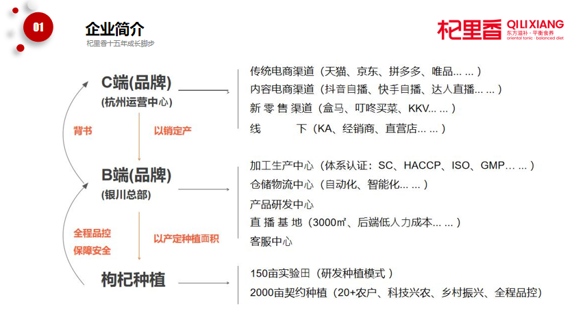 其次是数字化转型,作为一个创业公司,杞里香一步一步在摸索。现在有物控部门、品控部门,采购、生产、调拨整体联动。作为电商企业我们是善于做数据分析,像市场分析、客户管理、物流管理、财务管理等模块都是各自独立的数据系统,不能形成合力,信息流转的效率也比较低,现在我们通过数字化转型把销售端和生产端、采购端、种植端、财务端全部打通,整个信息流通时效很快。库存管理系统全部做了集成,溯源监管平台可以追溯到每个产品的源头。数据驱动以市场为导向,以用户需求为起点,以销助产,以产来定种植,一二三产融合发展,实现整个产业的高质量发展。
