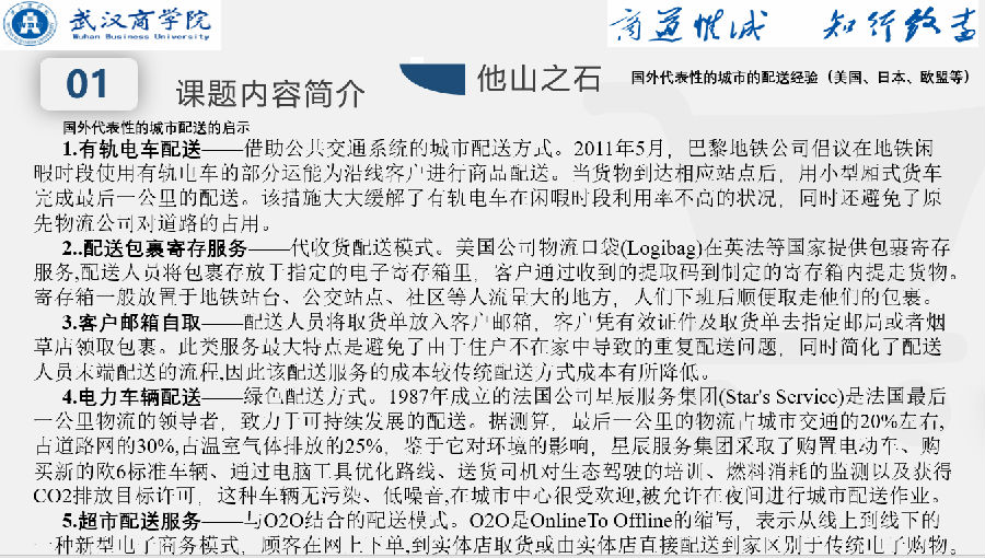 通过分析比较国外的配送经验,包括国内一些好的做法,我们得到了一些启示,比如说有轨电车配送,以武汉市为例,现在地铁基本贯穿了整个武汉市,那个时候还没有,配送包裹寄存服务,包括客户邮箱自取,还有电力车辆配送、超市配送等等模式。