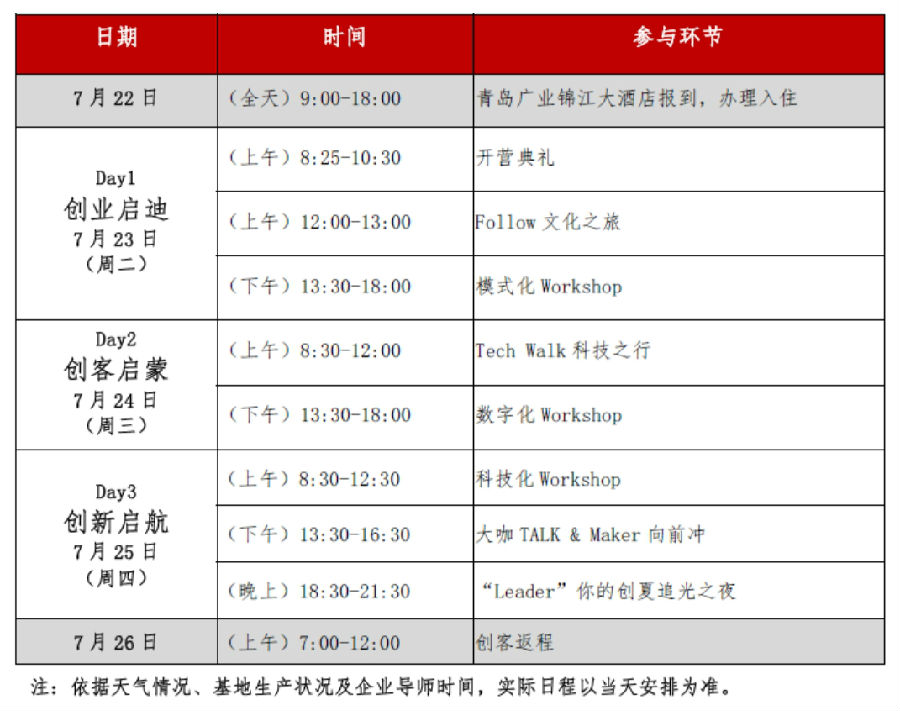 2.学生及带队教师在企业的行程、食宿由日日顺供应链安排并承担相应费用,青岛酒店住宿预定时间为7月22日-7月25日(共4晚)。往返青岛交通费、安全保险及在青岛期间个人其他花费均由学校/学生自理。
