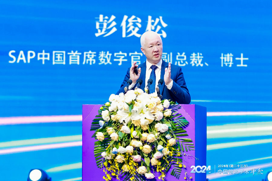 SAP中国首席数字官、副总裁、博士彭俊松进行《企业智能化转型:AI技术定义物流和供应链的未来》主题演讲