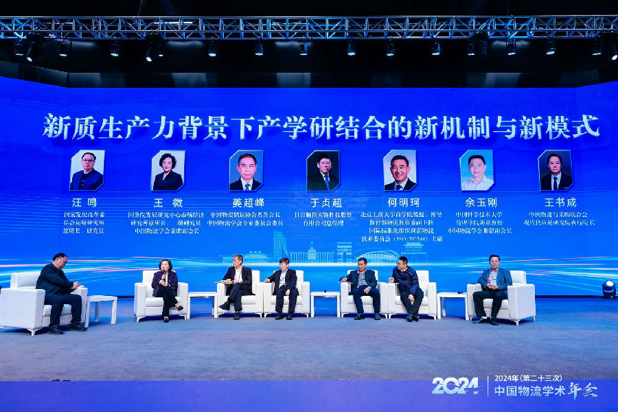 国家发展改革委综合运输研究所原所长、研究员汪鸣主持了互动沙龙环节。国务院发展研究中心市场经济研究所原所长、二级研究员、中国物流学会兼职副会长王微,中国物资储运协会名誉会长、中国物流学会专家委员会委员姜超峰,日日顺供应链科技股份有限公司总经理于贞超,北京工商大学商学院教授、物流教指委副主任,国际标准化组织创新物流技术委员会(ISO/TC344)主席何明珂,中国科学技术大学管理学院讲席教授、中国物流学会兼职副会长余玉刚,中国物流与采购联合会现代供应链研究院执行院长王书成围绕“新质生产力背景下产学研结合的新机制与新模式”进行了交流与探讨。